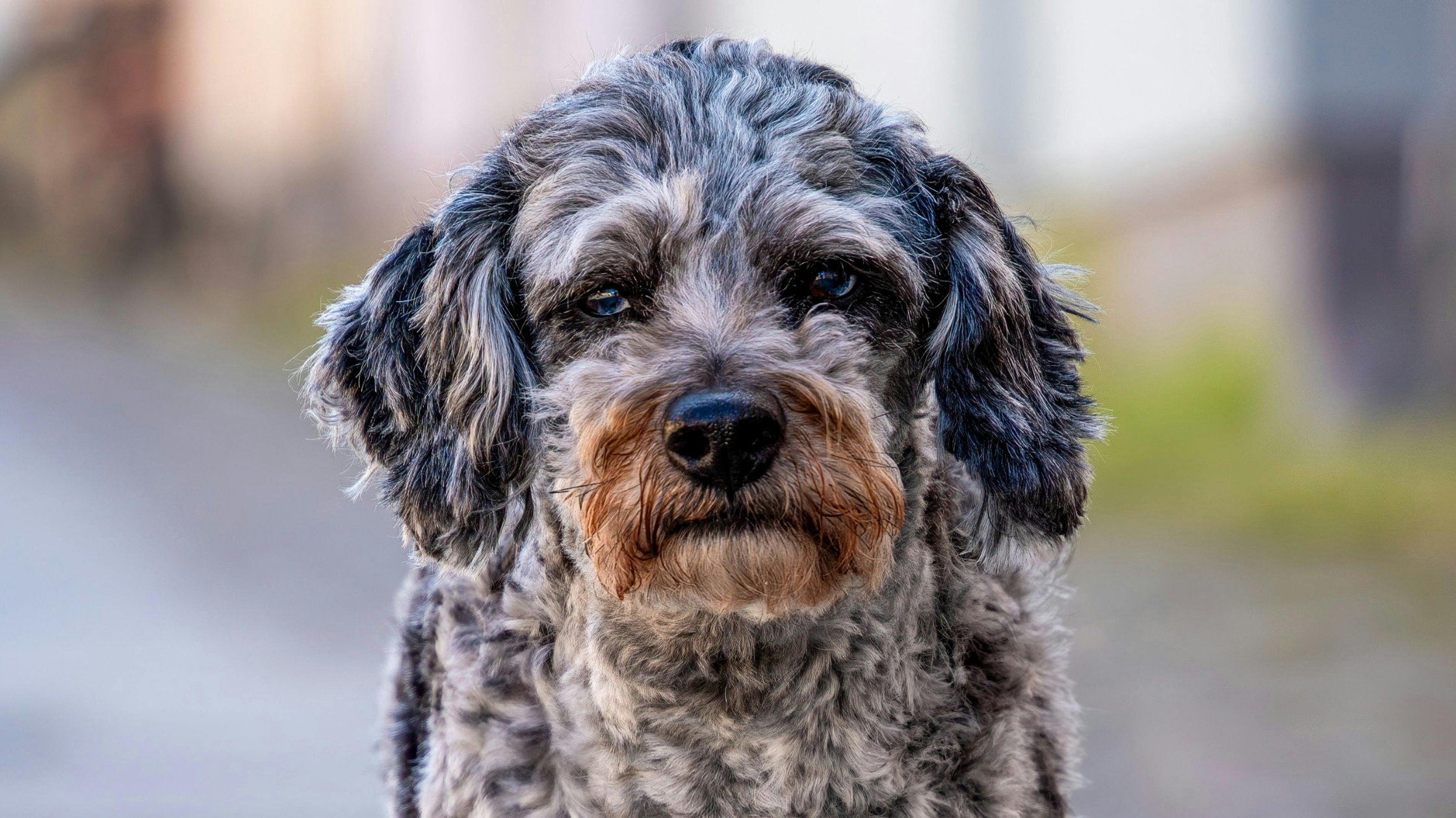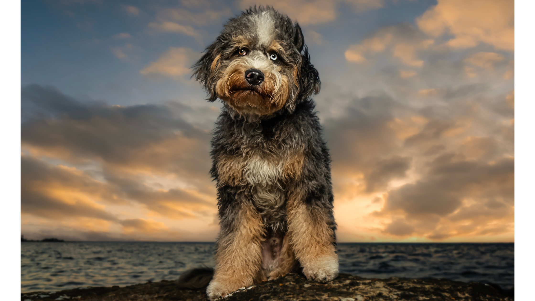 Blue merle is perhaps the most recognizable aussiedoodle pattern. A blue merle aussiedoodle displays a marbled coat of black, white, and gray patches that create a stunning, almost ethereal appearance. The merle pattern affects not just coat color but often results in striking blue or heterochromatic eyes.
