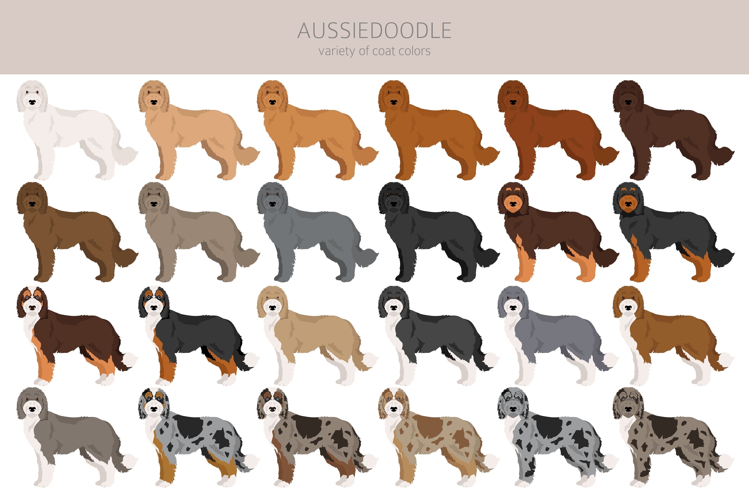 Solid coat colors include classic black, rich chocolate brown, cream, white, and silver variations. Many aussiedoodles also display bi-color or tri-color patterns, combining these base colors with white markings on the chest, face, and feet.