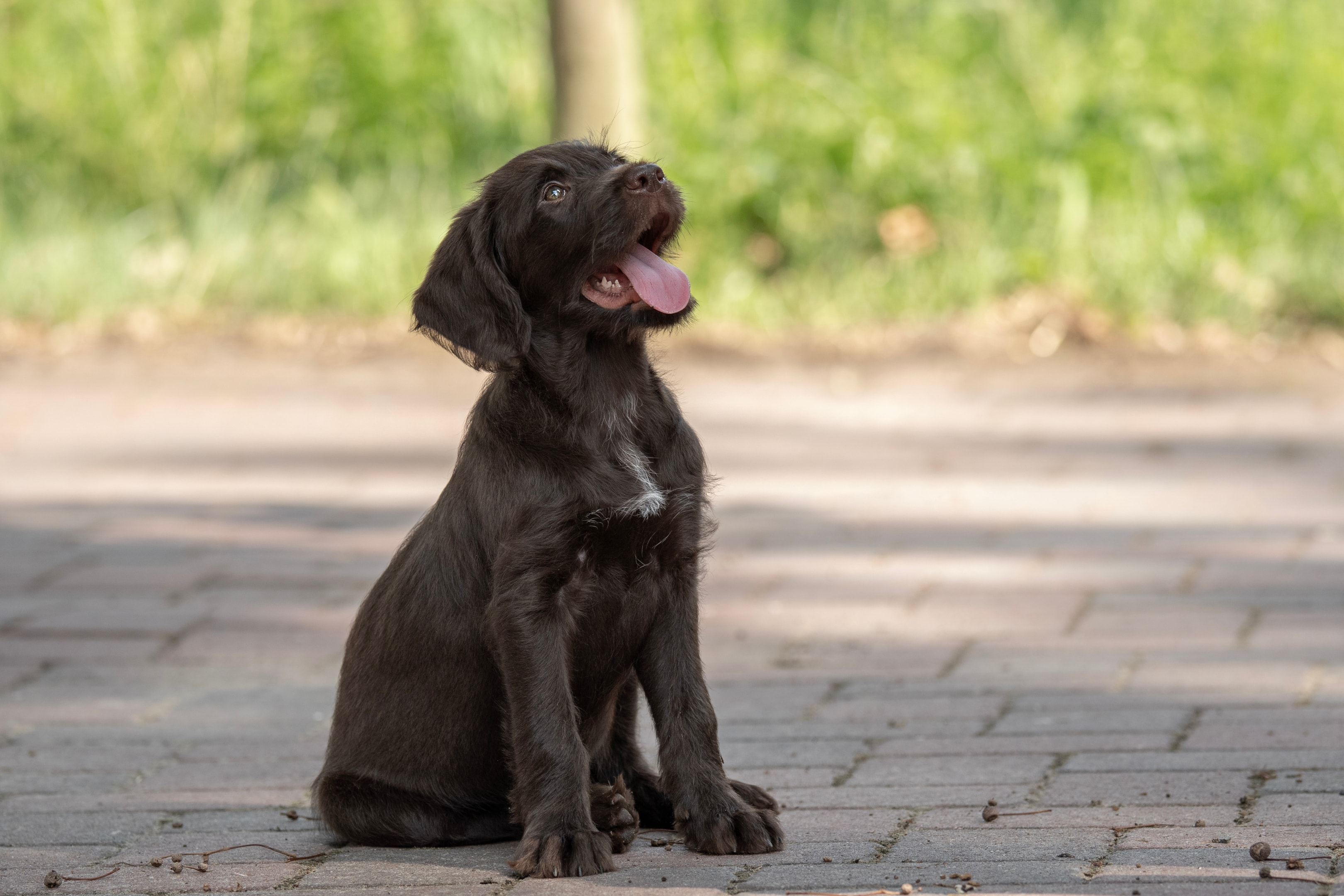 While often compared to the German Wirehaired Pointer, the Pudelpointer has its own unique look—alert amber eyes, well-proportioned head, and large, floppy ears that lie close to the cheeks.