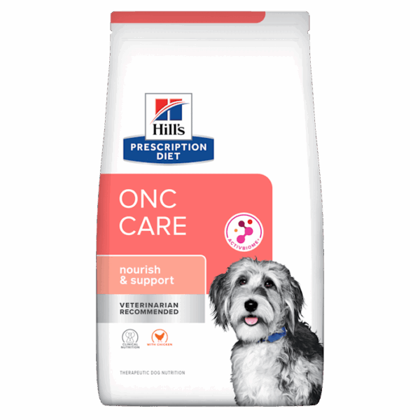 When dogs have cancer, ensuring their nutritional needs are met is critical. Therapeutic foods for dogs with cancer are designed to help maintain strength and energy as well as encourage eating from the very first bowl. Hill’s nutritionists and veterinarians developed the clinical nutrition of Hill’s Prescription Diet ONC Care to specifically help nourish and support dogs fighting cancer. This dry food is made with chicken and is designed to be our best tasting nutrition yet, with flavorful fats and highly digestible protein. The highly digestible nutrients in Prescription Diet ONC Care are easy for pets to absorb and the formula also contains ActivBiome+, a proprietary blend of prebiotic fibers to support a healthy GI microbiome and shown to provide consistent stool quality.